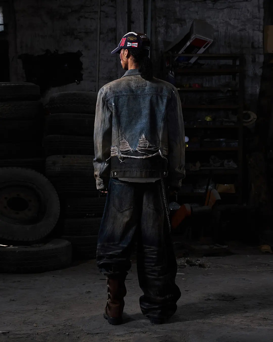 Q2: How is the unique "aged" visual effect achieved? A2: The jacket features a bold two-tone spliced wash. The upper section is light-washed with a nostalgic "monkey wash" (sandblasting) effect, while the lower section remains a deep indigo. We utilized hand-wiping and "dirty" distressing to create a seamless, natural transition, giving the piece an authentic, time-worn patina.